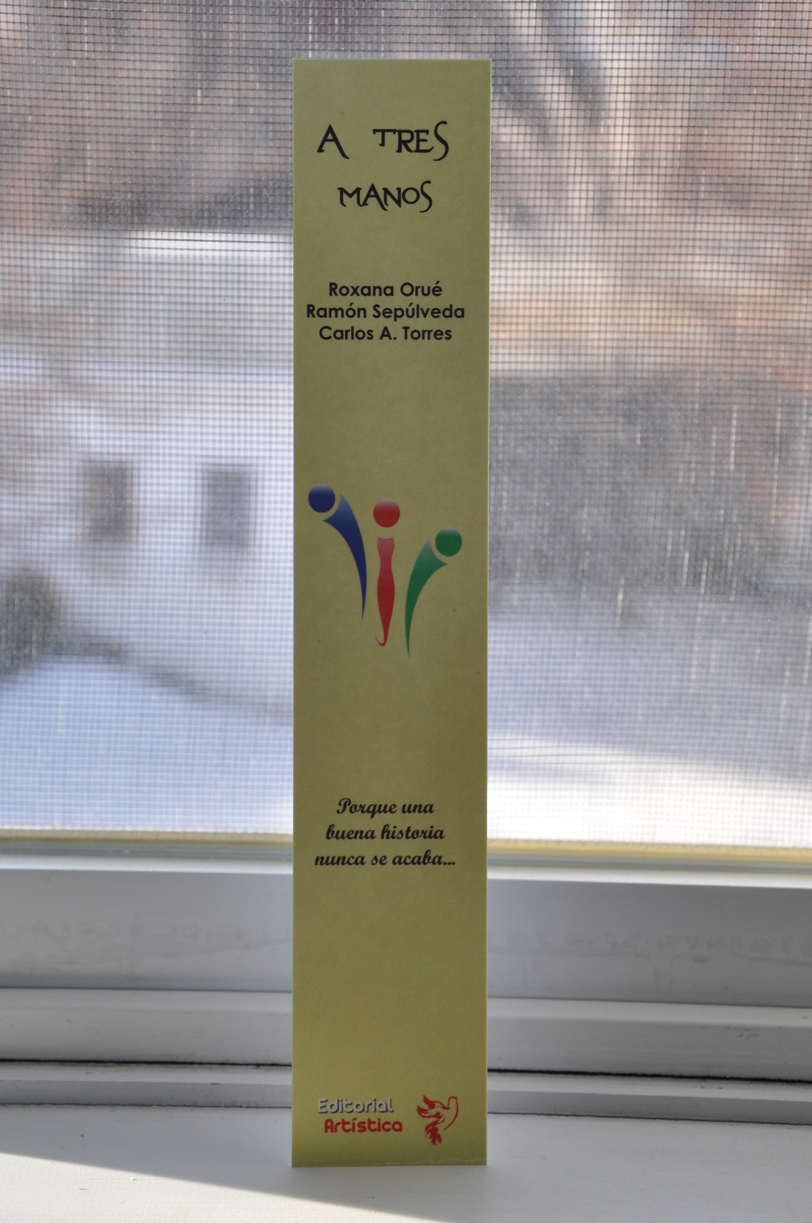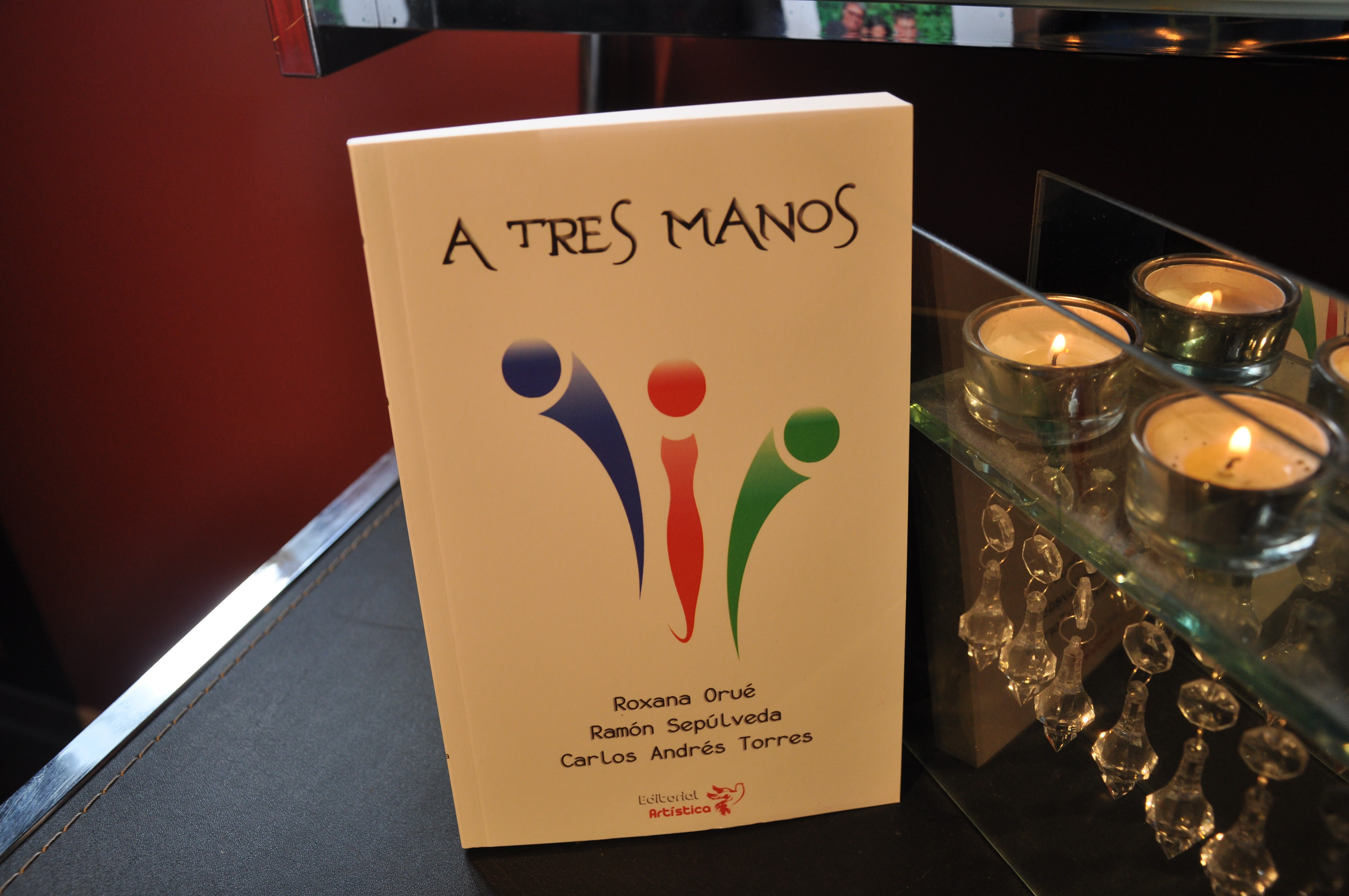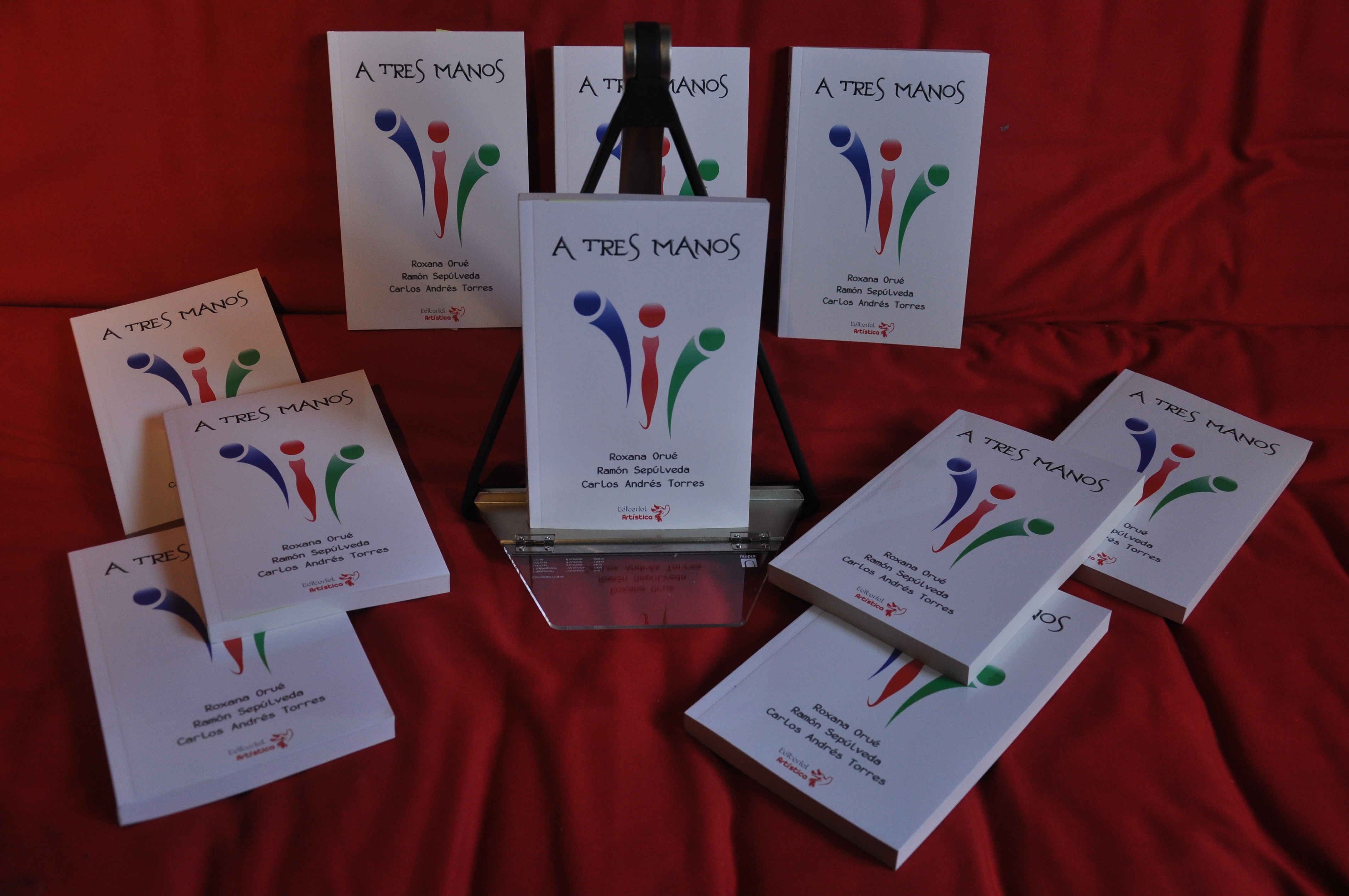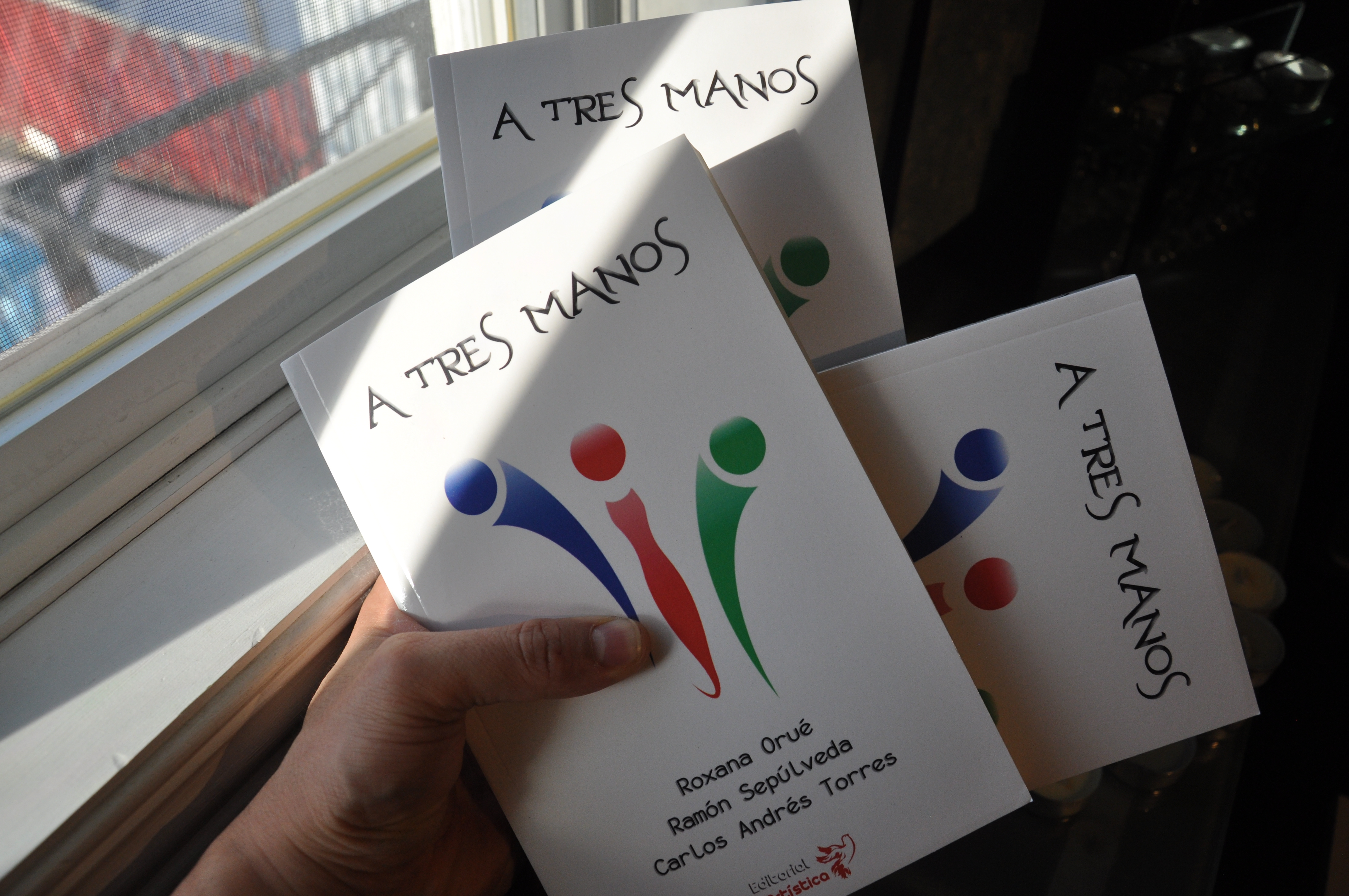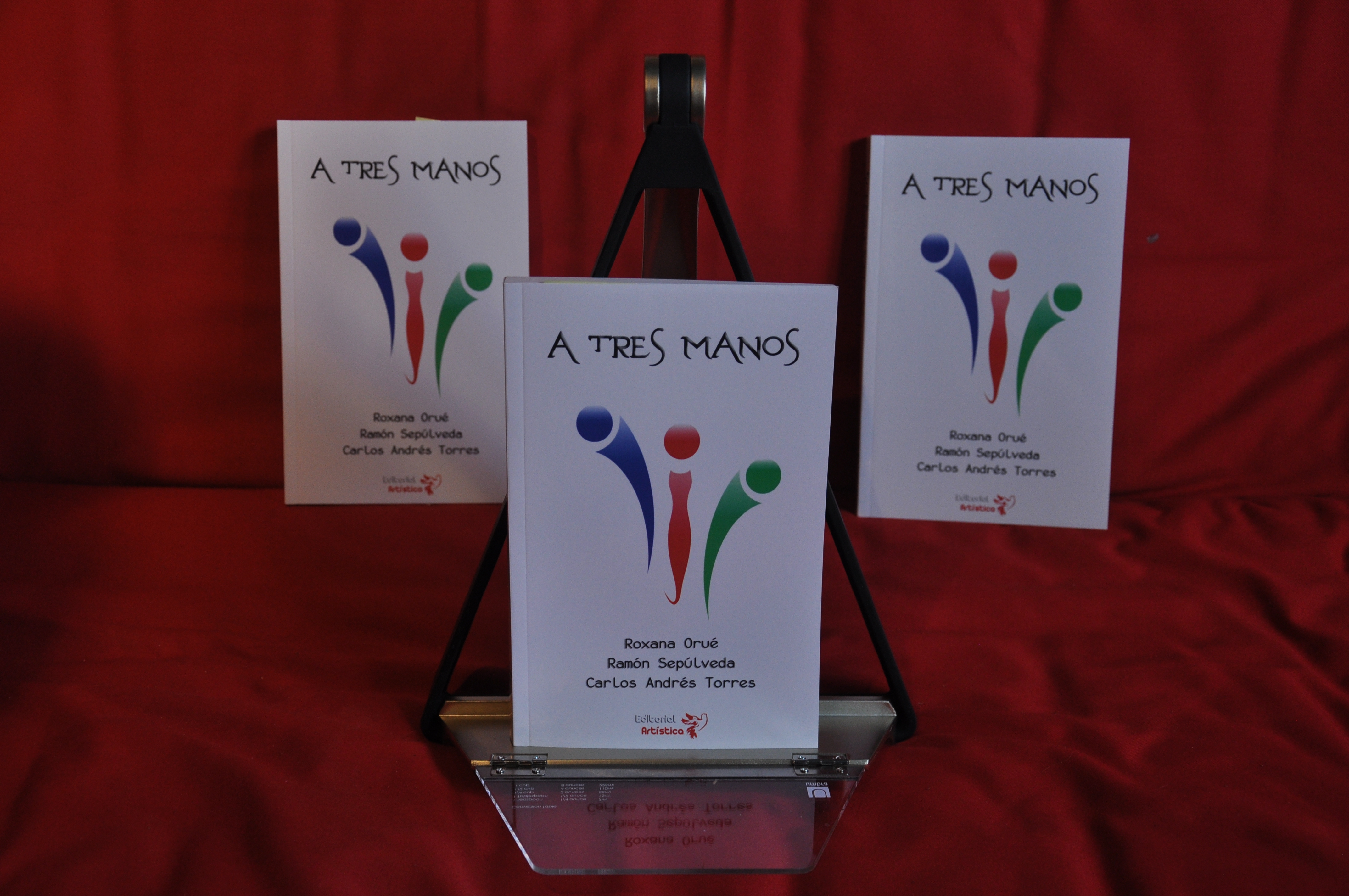A tres manos es una obra escrita en forma conjunta por tres autores. En la primera sección del libro un escritor inicia un cuento y los otros dos lo continúan. En la segunda sección cada uno de los autores escribe un cuento adicional en forma exclusiva. Con un total de doce relatos, el libro toca temas tan variados e interesantes como el del erotismo, la religión, la vida y la muerte, la amistad, la naturaleza y la historia de la migración en Canadá.